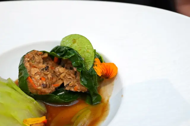 未來肉(植物肉)加入多種蔬菜,例如香菇、馬蹄、紅蘿蔔、西芹、醃料,塑成球狀以芥蘭葉包裹,炸過再滷製。點綴大黃瓜、滷筍乾,金蓮花、金蓮葉。