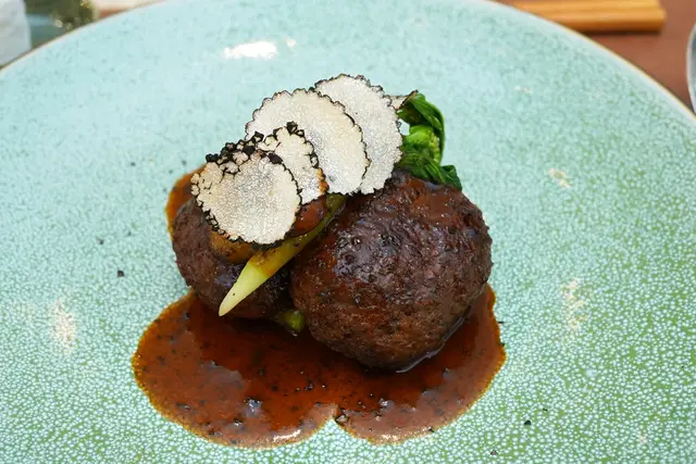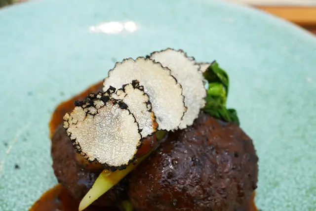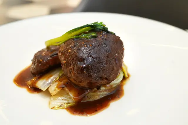 羅西尼經典的三大食材:松露、菲力、鴨肝,用猴頭菇、香蕉取代,底部是松露醬汁,搭配義大利黑松露,松茸、奶油豆蔻燴蘆筍,成為你們眼前這道「蔬食羅西尼」。