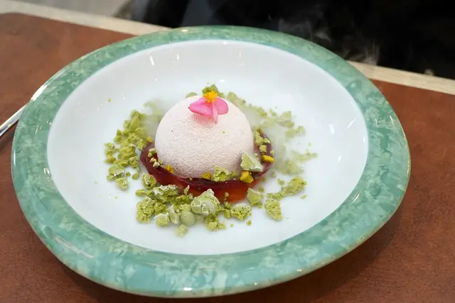 主體是開心果慕斯、白玉甜桃凍、熱內亞海綿蛋糕、可可噴砂,羅勒冰沙。周圍是紅玉李子,低溫烘烤,去皮切片加點橄欖油,做成裙邊。
