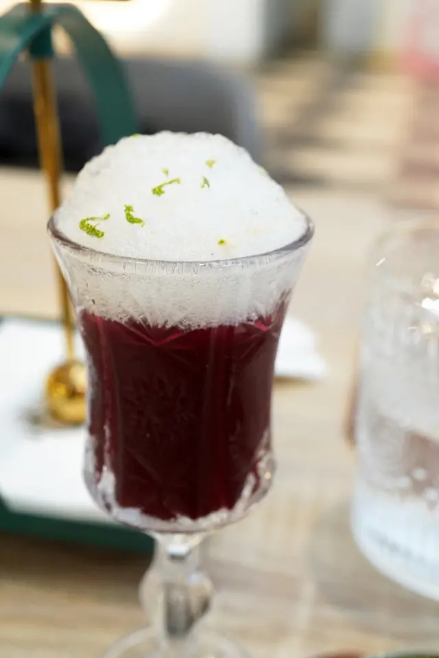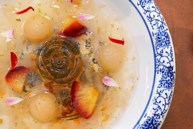 以冰糖、銀耳、雪梨、桃膠燉煮,中間是用台灣桂花做的玫瑰造型茶凍,再搭配當季時令水果,喝起來自然清甜。