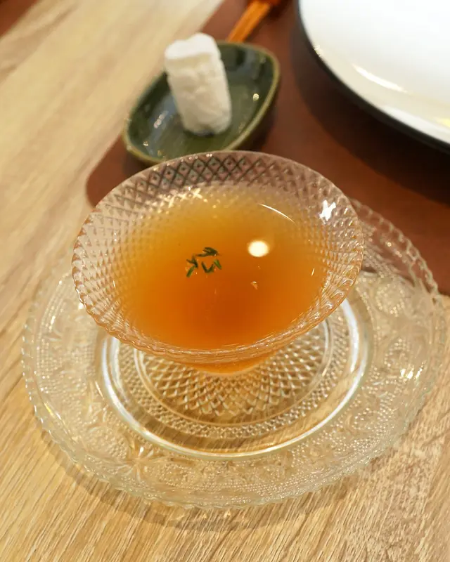 最底部湯汁以牛番茄熬製的澄淨番茄水,搭配羅勒油增添風味。