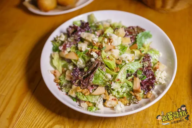 頗為大盤份量的沙拉,有沙拉葉、蘋果、藍紋起士、芹菜、核桃,葡萄蜜蜂果醬、大蒜麵包丁、最後搭配藍紋起士沙拉醬,可以說很經典的美式沙拉而且口感頗為豐富。