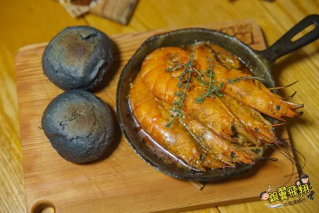 超大個頭的天使紅蝦,搭配濃郁的醬汁是一道吮指料理,旁邊的墨汁麵包也可以搭配醬汁很夠味唷!