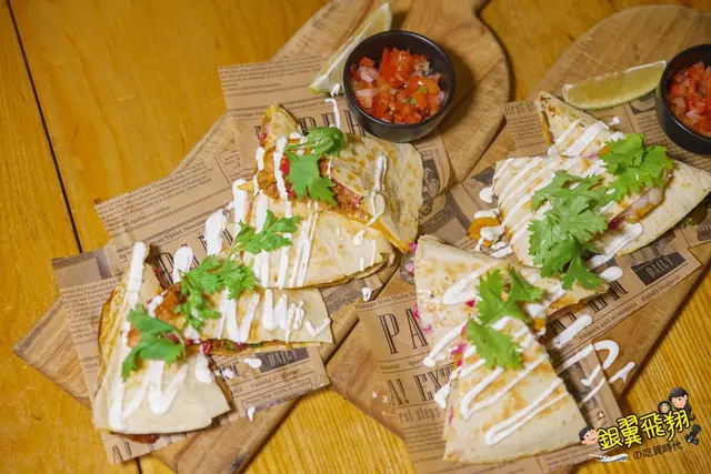 喜愛墨西哥料理的人,一定不能不點這一道煎餅有兩種口味,有豬肉、起司內餡在搭配烤酥脆的薄餅與上面的提味酸奶油,一吃往往會令人停不下來先吃三塊。