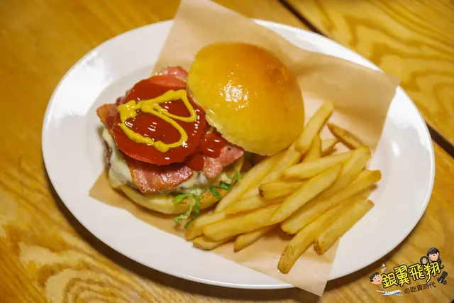 牛肉排、切達起司、培根、番茄片、洋蔥、生菜、漢堡醬、番茄醬、黃芥末,搭配奶油漢堡麵包,兩種醬汁搭配除了刺激味蕾還可以增添風味。