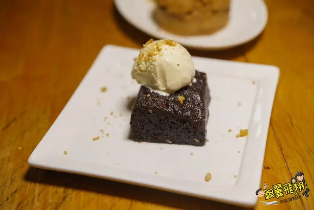 巧克力布朗尼有杏仁、蔓越莓層次口感,在搭配香草冰淇淋、堅果碎粒,這一位布朗尼不會過於甜而且巧克力濃郁,因為冰淇淋容易融化上桌要盡快享用。