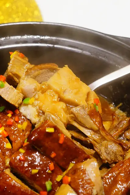 香芋梅子鴨煲用的是宜蘭的櫻桃谷鴨,台灣的鴨子肉實皮薄,沒有腥膻味,單看處理的過程就知道為什麼這道菜能夠入味十分,富哥先把紫蘇梅去籽搗爛,和調味料一塊兒塞進鴨肚裡醃上半天,然後入鍋炸到皮色酥黃,之後取出梅肉,和剁塊的鴨肉一起放進蒸籠裡蒸上20分鐘,接下來才倒進煲鍋裡,這時候芋頭上場,和著上湯一起煨煮到剩下三分湯汁才算大功告成