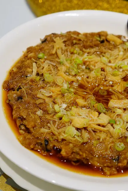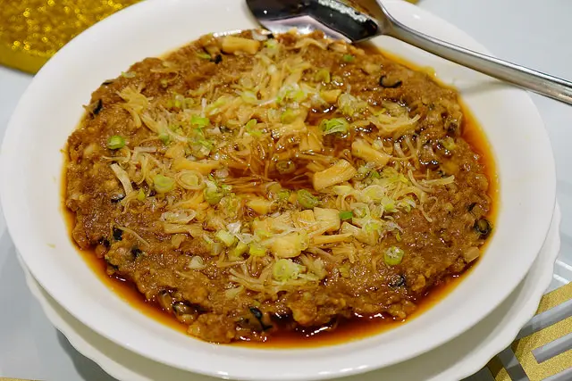 之後再把日本進口的大瑤柱泡軟之後,撕成細絲加入碎肉裡,再把瑤柱水倒入碎肉裡打出筋性,這樣的肉餅蒸起來不但多汁柔軟還會蓬蓬的,可想而知這道加了好多干貝絲的蒸肉餅湯汁會有多鮮甜了吧!每一口還吃的到爽脆口感的馬蹄,很豐富又很多層次