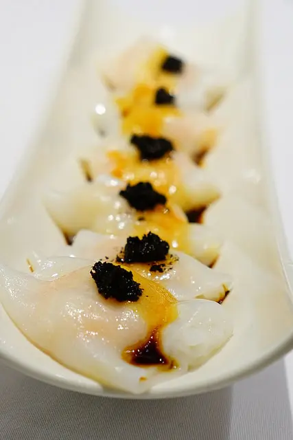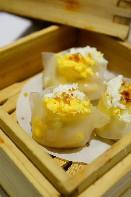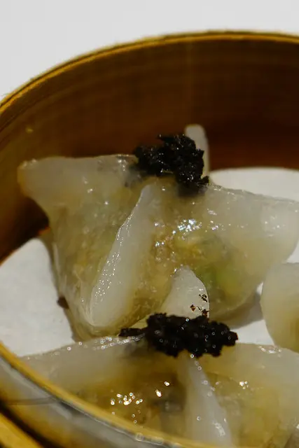 晶瑩剔透的蟹肉芙蓉餃也是這次的新點心,用肥美的大沙公拆下來的蟹肉和上鮮蝦做成的海鮮餡料,滿滿的填入薄而透明的燒賣皮裡,上頭除肉蟹肉在放上香港師傅最擅長的炒蛋白,這種Q滑入口絲綢般的感受誰抵擋的了