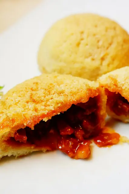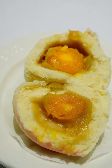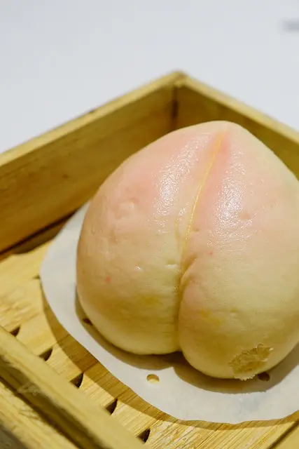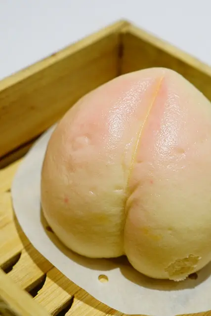 與台灣的壽桃不同,皇母獻壽桃好大一顆,絕對吃一顆就飽了,裡頭的餡料是用一整顆新鮮鹹鴨蛋裹進蓮子、白油、砂糖熬煮的白蓮蓉裡,粉粉嫩嫩的白白胖胖,噴上紅色大頭菜榨出來的汁液,就像一顆鮮豔欲滴的水蜜桃一樣