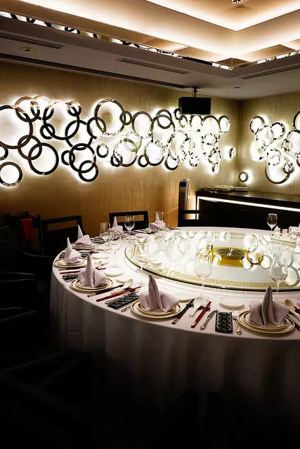 位在高雄漢來大飯店12樓的「名人坊」是由原本漢來大飯店最頂級的東方樓魚翅餐廳變身,漢來美食依舊遴聘日本設計大師橋本夕紀夫團隊操刀設計,融合東方樓原本的尊貴典雅與橋本擅長的簡約時尚風格,6尾磐踞在天花板的原木巨龍,雙雙演出雙龍搶珠,呼應沉穩的原木格窗,襯上大片的夜空灰地毯和黑色櫥櫃,座椅則以黑色燒花絲絨為主,舖上雪白口布,結合西餐廳的俐落,呈現成熟與神秘氛圍