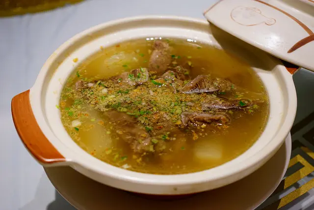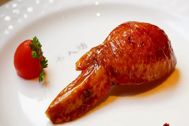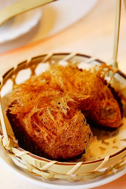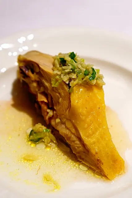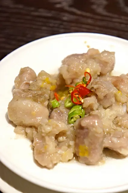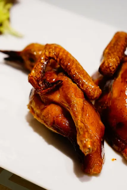 想像一下雞翅裡塞進了浸滿高湯的燕窩,外皮刷上麥芽糖水風乾後再油炸至金黃,雞皮緊繃繃的,咬開酥脆薄香的雞皮接踵而來的是爆出來的燕窩,裡頭還不經意的滴出雞油與雞汁,肉嫩嫩的,燕窩也嫩嫩QQ的,每一口都奢華無比