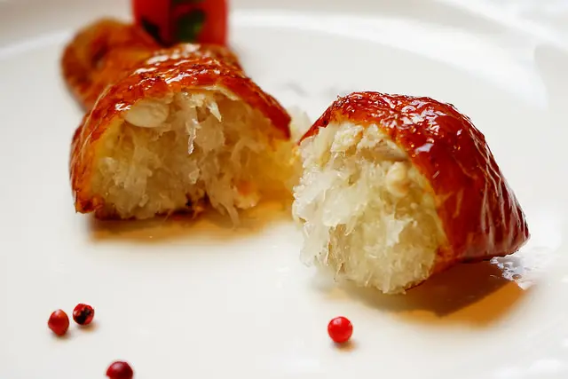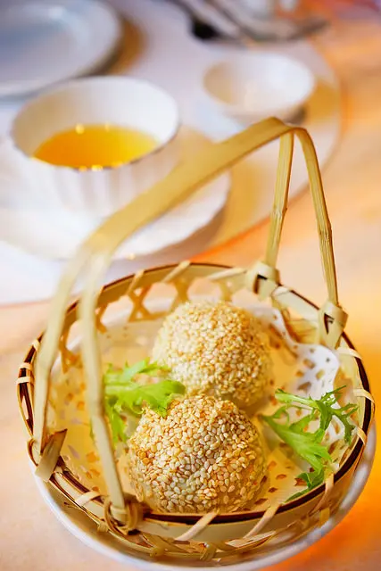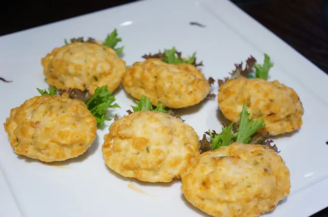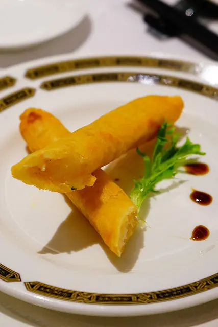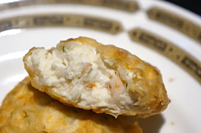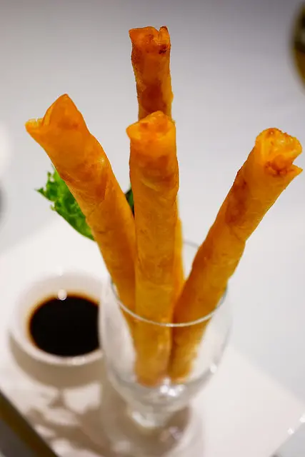 裡頭是包著蝦漿蝦肉之類的,外層酥脆不膩,蒜味挺重的,是很涮嘴的點心,其實不用他附的沾醬就挺有味道的了