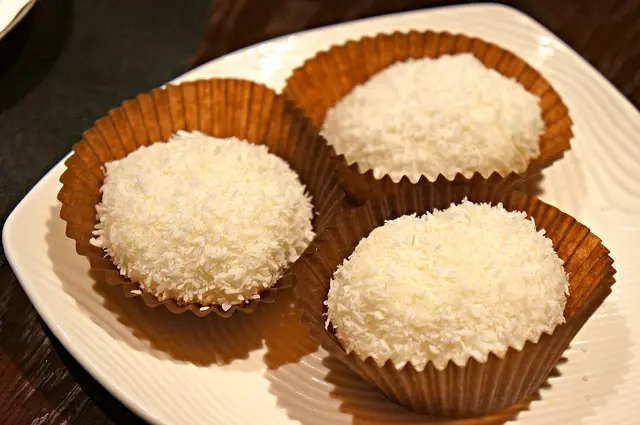 香芒雪米滋,就是我們的麻糬,外層裹著椰絲,裡面是會爆漿的芒果果泥,冰的涼涼的,吃起來又軟Q又香