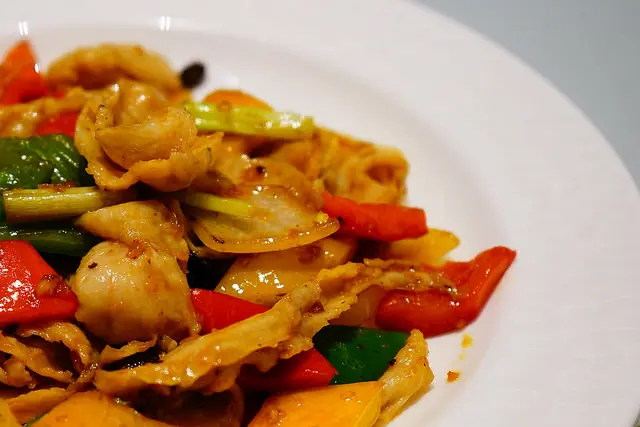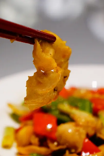 取豬肚最前端之肚尖部位,片成約0.2 公分薄片,吃起來的口感亂像象拔蚌的,是薄薄脆脆的口感,跟一般吃到的豬肚完全不同,所以這一盤鼓椒炒肚尖就用了4.5頭豬,也是一道很需要刀工的菜色