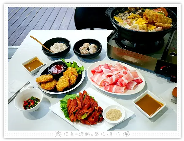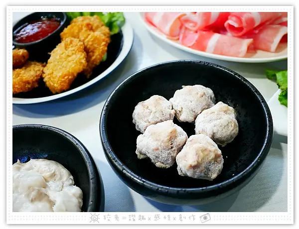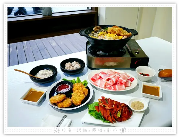 點了附肉盤的酸菜白肉鍋,我們另外單點火鍋配料花枝漿、芋頭鮮肉丸,還有炸物類的金錢蝦餅、酥炸肥腸,各位亦可參考菜單中的雙人套餐、四人套餐、六人套餐方案。