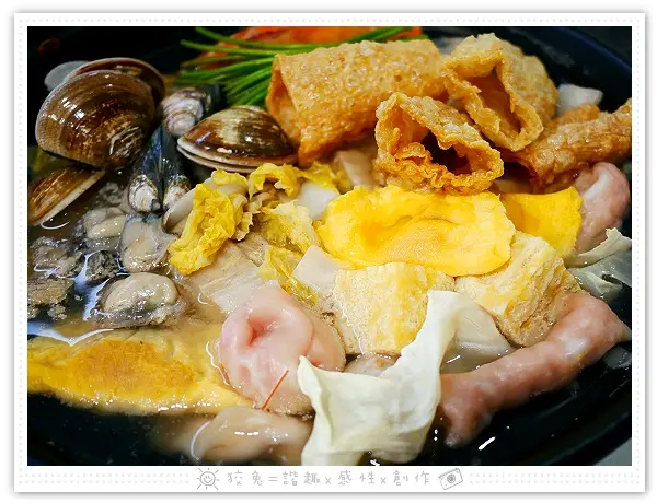 底下是大量的酸白菜,外加高麗菜、水蓮、豆皮、凍豆腐、魚丸、燕餃、魚餃、蛋餃,還有蛤蠣、鮮蚵和蝦子!