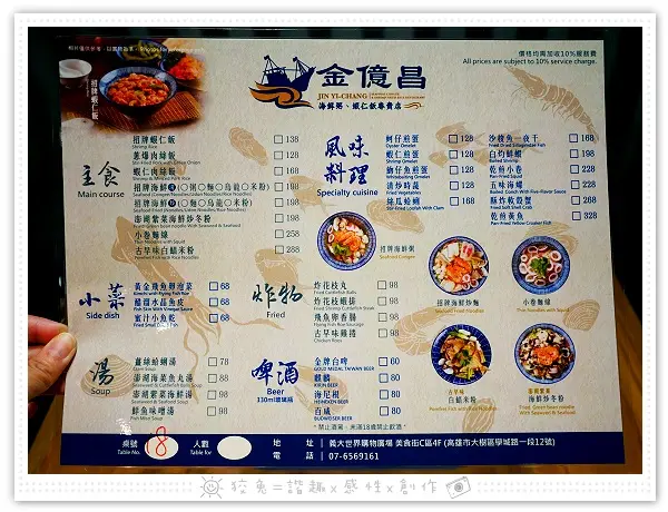 附帶一提,「小卷麵線」是使用澎湖麵線,菜單上面還有獨特的「澎湖紫菜海鮮炒冬粉」,以及經典台菜「古早味白鯧米粉」!初訪的遺珠之憾何其多,不過沒關係,金億昌除了義大世界購物廣場這個服務據點,咱們去新光三越高雄左營店、高雄三多店也吃得到!我深信該餐飲品牌仍會繼續成長茁壯,當天裝不進肚子的其他餐點,有待日後再逐一嚐試!