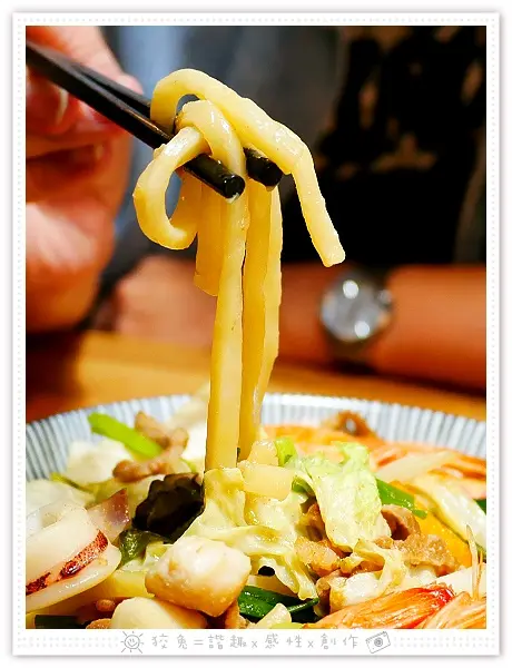 乾炒類提供麵、烏龍、米粉三種選項,我個人一向習慣吃炒烏龍,厚實Q彈有咬勁,而且飽足度勝過其他麵種!醬汁結合眾多海鮮精華,附著於麵條之上,大口一吸是恰好的夠味!