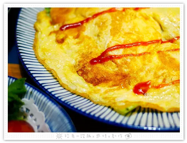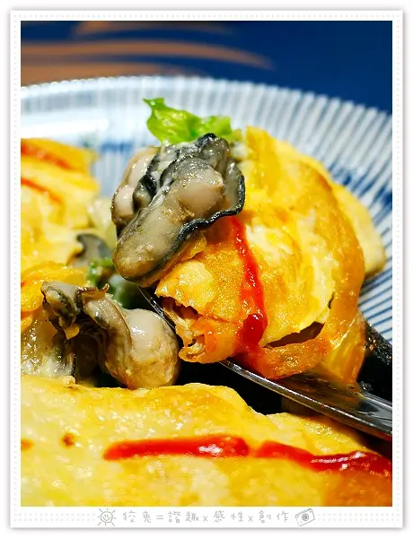 切開後,碩大肥美的蚵仔軍團重見天日囉!蛋中還夾帶著蔬菜,我下意識聯想到國民小吃蚵仔煎,但這煎蛋顯得清爽許多!