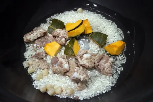 就在一開始店員添加了生米飯、排骨、干貝高湯進去蒸汽鍋內烹煮