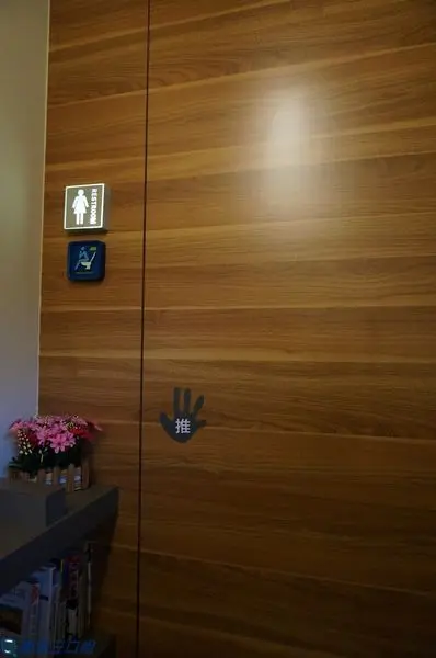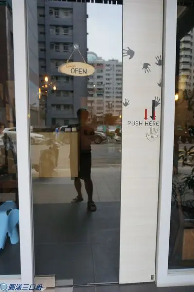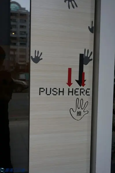 玻璃門上有著手掌印記,提醒著出入口的位置...