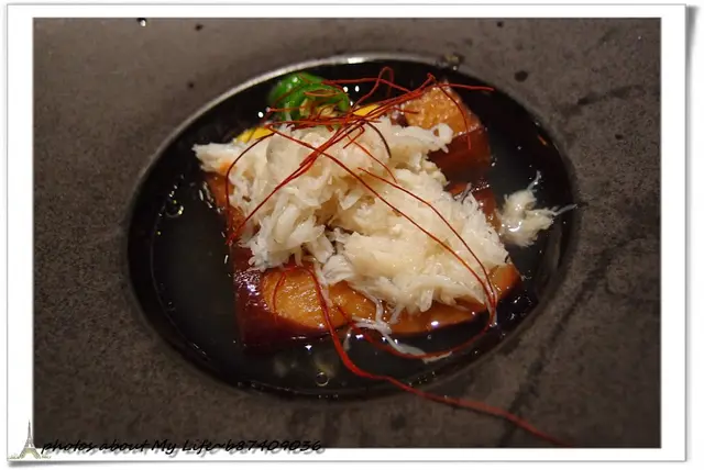 上頭雪白的是鱈場蟹絲 底下是醃醬茄子(名字是我亂取的XD)