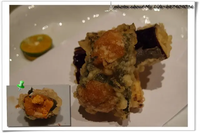 海膽大多是生食吞下肚品嚐鹹甜鮮味 箸卻是用紫蘇包著海膽下鍋炸成天婦羅 很有創意的一品
