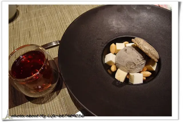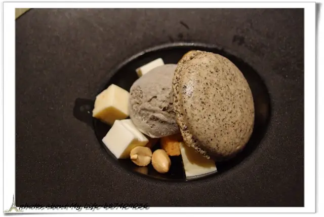 這次的甜點也不賴 芝麻冰淇淋和馬卡龍 搭配杏仁和香橙凍 底下還有手工餅乾加香橙醬