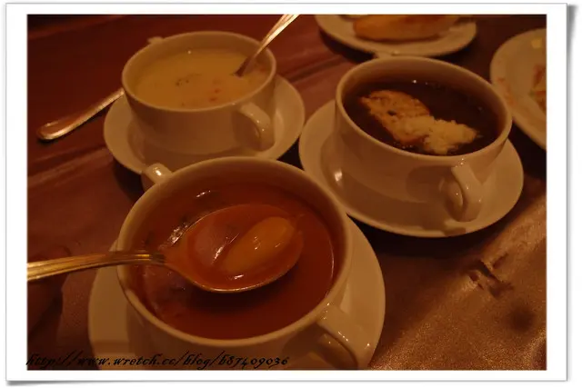 湯品點了"玉米濃湯"&"洋蔥湯"和"奶油蟹肉番茄菠菜湯"