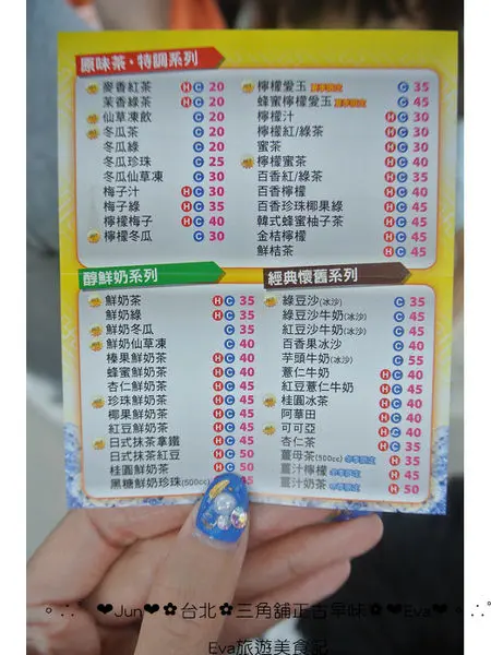 說起對喜歡喝手搖杯飲料的人而言,台灣大概真是世界知名的天堂,除了飲料的內容五花八門,且什麼都能混外,近年來連杯身也開始有著創意十足,與驚人的變化!!之前,出現了話題性十足的〝小鮮肉〞杯身,當下老婆就躍躍欲試,但我對〝小鮮肉〞總是提不起興趣,於是她也就一直沒機會嚐試到;沒想到近幾週在FB上,出現了被狂轉的〝鴛鴦分享杯(雙響炮分享杯)〞,老婆一看到店家地址,是在中和大潤發附近的莊敬路上,且也有〝小鮮肉〞…。唉~好吧、好吧,誰叫我是老婆和子女,幾乎是如有求必應般的聖誕老人呢!!點手搖飲料時,對這個也想喝那個也想喝,也就是像我老婆一樣三心兩意(大誤,哈!!)老是猶豫不決的人,或是想曬恩愛放閃的情侶…,業者發揮這獨特創意所設計的鴛鴦(雙響炮)飲料杯,將飲料杯〝一分為二〞,且只需約一杯的價格,就可以喝到兩種不同口味的飲料,真是大大滿足了與虜獲不少鄉民的心~而去年引起一陣話題,而超夯的〝小鮮肉〞瓶身,對像我老婆這樣已邁入狼虎之年,或是年輕開放的年輕女性族群而言,一拿在手,可是好像會莫名的開心,笑個不停「三角舖正古早味冰品茶飲」雙響炮分享杯,杯身約是700c.c.的大容量,其計價方式,則是客人所選擇的兩種口味的原價相加後,除以2再加5元。不過不用擔心價格會偏高,因為攤家本來一般杯的飲料價格就不貴,加5元則是店家的成本高出許多,如杯身特製外且相較一般的厚,裝杯的時間會比一般多出至3倍的時間,即使你是點兩種最貴的口味〈如珍珠鮮奶茶〉,一杯700c.c.雙響炮分享杯的售價,還是不到50元。阿發覺得相較下,售價還算合理且便宜,特別是鮮奶用的是市面上有品牌的鮮奶。而其飲品口感,阿發覺得還算不差,不會有很死甜膩的口感,風味也相較較為自然些。只不過,由於這雙響炮分享杯最近實在太夯了,往往下午未到攤家的營業時間,攤前就出現排隊的人潮,加上分享杯會讓店家裝杯花較久的時間,所以分享杯一天限量120杯,且一人一次限購一杯〈一般杯不在此限,小鮮肉鮮奶茶則是售完為止〉。阿發當天12:40到達,排第一位(13:00開始營業),但攤前完全沒有遮陽(遮雨)的地方,由於到了現場才得知一人一次限購一杯,阿發只好再排一次,又排了約40多分鐘才買到第二杯。也就是我在大太陽底下,晒了超過1個小時!!當把飲料送去老婆公司時,老婆問我怎晒黑了,我只回她:『妳還好意思說!!沒確認到一人一次限購一杯,讓我人都到了,買也不是,不買也不是…』看她頗開心的模樣,唉,只好算了~只不過,想要前往嚐鮮的朋友,可要自行斟酌囉! ▲12:50,還沒到營業時間(13:00開始營業),就已出現排隊人潮攤家位在中和大潤發附近(走路約十分鐘吧~),莊敬路49巷29弄2號正對面,是一座露天私人停車場的入口旁 ▲下午一點開始營業攤前完全沒有遮陽(遮雨)的地方,天氣越來越熱,排隊的人又多…提醒若要前往,可要考慮是否帶把遮陽傘 ▲價目表如同一般手搖杯飲料的攤店家,飲料口味的選擇不少,且是很平價的價位但… ▲激推人氣商品(分享杯組合選擇)由於最近「三角舖正古早味冰品茶飲」,實在太夯了,人潮也實在太多~加上裝杯不易,為了節省大家的時間,無論是分享杯或一般杯,店家改只提供這10來種口味的選擇且沒有熱飲 ▲小鮮肉鮮奶茶攤前貼有明顯的〝小鮮肉鮮奶茶…〞字樣 ▲手沒停過的老闆老闆模樣很酷,也不太想和客人多說太多,只因分享杯裝杯較一般的費時許多,因此不想分心,而更擔誤後面排隊等候的時間 ▲帶著手套冰箱與飲料桶看起來蠻乾淨的,且老闆兩手都帶著手套,我也沒看到他碰錢,讓我原本看到有如路邊攤的攤位,所產生其衛生上疑慮,有比較放心 ▲小鮮肉與分享杯老婆想要喝,傳說中的小鮮肉鮮奶茶與雙響炮分享杯,終於買到了~雙響炮分享杯,杯身約是700c.c.的大容量,其計價方式,則是客人所選擇的兩種口味的原價相加後,除以2再加5元。而阿發覺得先以飲料外觀來說,因為攤家本來一般杯的飲料價格就不貴,加5元則是店家的成本高出許多,如杯身特製外且相較一般的厚,裝杯的時間會比一般多出至3倍的時間,即使你是點兩種最貴的口味〈如珍珠鮮奶茶〉,一杯700c.c.雙響炮分享杯的售價,還是不到50元。阿發覺得相較下,售價還算合理且便宜,特別是鮮奶用的是市面上有品牌的鮮奶。 ▲小鮮肉與分享杯由於在大太陽下排了一個多小時,阿發一買到,就到離約不到50公尺旁的便利店休息,且順便先品嚐一下 ▲小鮮肉鮮奶茶,側寫好讚的胸肌和腹肌難怪,對像我老婆這樣已邁入狼虎之年的女性會有著莫名的吸引力~ ▲分享杯-珍珠鮮奶茶+檸檬愛玉 ▲開心的老婆你看看、你看看握著小鮮肉,就如此開心嘖嘖嘖~ ▲享用阿發覺得分享杯先只單喝一種口味,相較一些號稱古早味和超大杯的攤家,不會有很死甜膩的口感,風味也較為自然些,但還不到驚豔的程度。不過,要是改成先一口甜再一口酸,或是先一口酸再一口甜,個人覺得這樣喝起來,還真是非常過癮!!如同泡溫泉時,一下泡冷水池、一下泡熱水池,不斷交替喜歡的人會覺得很爽,不能接受的人,大概會覺得一下天堂、一下地獄吧所以,兩種口味要怎搭,可要先想清楚喔!!而小鮮肉鮮奶茶,口感就是不會過於甜膩,且是真正倒入鮮奶,而不是泡奶粉的鮮奶茶。不過瓶身倒是很特別,也頗新奇晚上老婆和女兒還討論起來,喝完的瓶身,洗淨晾乾後倒入抹茶變綠巨人倒入鮮奶變白人倒入黑咖啡