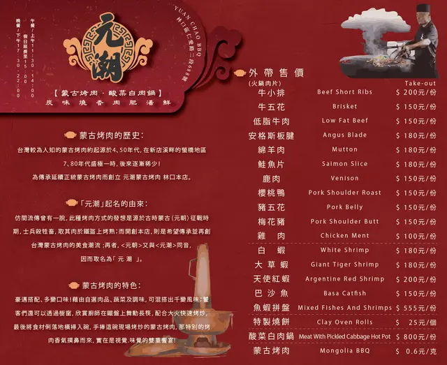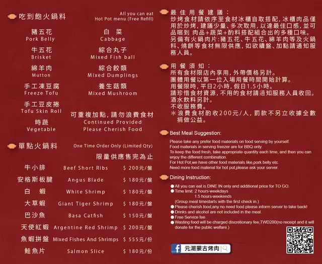 元潮蒙古烤肉 (新北/基隆) 網上訂位即賺Rice Dollars 網址: https://s.openrice.com/cHRSmG2ScO600 地址: 新北/基隆林口區仁愛路二段688號 電話: +886 +886226098989
