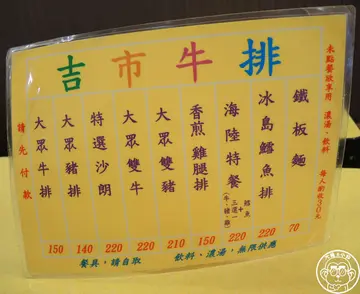 今兒個一早為了我們之後的蜜月旅行先到世貿秋季旅遊展去看看了解一下~不過這人實在是多到寸步難行!真是擠爆了天啊,不過我看大多都是為了餐券在排隊吧!因為事前還沒做功課,所以也沒急著馬上下訂雖然價格實在是差很多,不過怕日後會有甚麼問題所以先看看就好囉! 傍晚我們來到三和夜市找我拍婚紗用的鞋子,買完後想想乾脆吃完再回家吧! 而三和夜市有間食尚玩家介紹過的超人氣牛排-吉市牛排。平常可是要排隊的呢!所以就一直沒到這拜訪過~ 不過我們今天時間早又下雨所以客人沒很多不用等唷! 大大的招牌趕快點餐囉! 點餐的飲料及湯都是無限取用的喔~ 湯還不錯喔!濃度適中,味道也香~而且裡頭的料可不少呢! 而且這家服務態度還挺好的!一位客人正在裝湯,裝滿多碗的所以有點久!而一位店員正要補充新的濃湯進去,他在後面拿著一大鍋不算輕的湯默默的在後面等客人裝完,也沒有站在旁邊給客人壓力!而是默默地搬著湯站在後面~(給你一個讚) 附餐小餐包,烤得很香,可惜只有一個吃不夠,挺好吃的說~ 香煎雞腿排 (150元)。 我的雞腿排來囉!對女生來說應該算大塊的,麵的量也挺多的~ 看看這切面,有流口水的感覺了嗎?這雞肉真的很嫩,皮也不會煎的過焦或硬,是我喜歡的口感!而且麵也QQ的好吃。 接著是小鬍哥的牛排。小鬍哥最近為了拍婚紗可是花了一大功夫,所以連牛排醬料都不加...大眾牛排 (150元)。 不加醬的牛排應該也只有小鬍哥吃得下去,看看那一盤多無聊的牛排哈哈哈!不過小鬍哥表示肉質不錯,雖沒有雞肉多汁,但比一般牛排好吃。 不過這不加醬的麵的口感,小鬍哥只有一句話奉勸大家,沒事請不要學他哈哈哈!可想而知囉~他可以吃完我真佩服他! 誰說夜市裡的牛排找不到好貨,這裡就告訴你們一家,另在稱讚他們一下,吃到一半一位年紀稍長的阿姨來吃飯,店員還問需要幫您切好嗎?真的是很貼心啊~而且還是切成一塊一塊好入口的大小給阿姨,真是大大加分!…查看更多