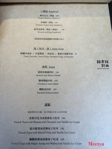 店家資訊:圖書館對面 Duimin cafe & deli地址:新北市中和區中和路400巷14弄2號電話:02-2923-0089營業時間:平日:11:00am~21:30pm六日:9:00am~21:30pm(遇到客滿用餐時間以兩個小時為限)免服務費提供WiFi鄰近永安市場捷運站,位於中和四號公園對面的"圖書館對面",是永和當地的熱門早午餐店假日從早上9:00開始營業,例假日上午11:00~14:00因現場人數比較多,所以無法訂位喔!!!一早,店內便是滿滿的人潮,近期店家全面更新菜單,便迫不及待前來嚐鮮了,大家一起來品嚐看看囉!!! 圖書館對面,顧名思義,就位於中和國立台灣圖書館對面,這名字讓人很有印象以綠色為主的牆面,還有一整片的落地窗,感覺真有圖書館簡約及樸質的感覺鄰近永安市場捷運站,步行約5分鐘左右,地理環境算相當便利工業風的設置,鐵製座椅及木質的桌面,搭配完全裸露的管線,喜歡工業風設置的朋友,可以前來享用美好的早午餐臨窗的小吧台,大約可坐7~8人,一早在這用餐,看著窗外熙熙攘攘的人群,感覺頗有意境!!!開放式廚房,可調製飲料及餐點,店內毫無油煙味,衛生環境掌控得很好!!!店內總共可容納45~50人座位左右,一早便湧入滿滿的顧客,建議先訂位MENU*早午餐全天供應*早午餐 附餐 冷/熱 咖啡or紅茶一杯更換各式飲料,價格半價優惠*飯類.湯咖哩烏龍麵.三明治 套餐優惠:餐點+飲料 價格可折抵 $30元*免收服務費燻鮭魚班尼迪克蛋 $290這是店內的人氣料理以2顆水波蛋,加上煙燻鮭魚在麵包上,並淋上荷蘭醬煙燻鮭魚相當嫩口新鮮,鹹香的滋味,在口中縈繞,配上上面的水波蛋,及清淡爽口的荷蘭醬,別有一番滋味!!!水波蛋的做法,蛋黃為5分熟,黃澄澄的蛋液流淌而出,蛋黃無蛋腥味,搭配底層的煙燻鮭魚,及柔軟有嚼勁的麵包體,整體走清爽的健康路線班尼迪克蛋一直是我早午餐的首選,最喜歡他的水波蛋,軟嫩的蛋白及新鮮的蛋黃液,雖然烹調起來比較費時,但真得風味獨特,很值得點選!!!旁邊有附新鮮生菜沙拉,有:小蕃茄.玉米筍.蓮藕.紅椒.黃椒.豆薯.苦瓜.紫萵苣.綠捲鬚.蘿蔓生菜.紅蘿蔔搭配濃郁.香甜的沙拉醬,感覺營養健康生菜都有冰鎮過,所以爽口.自然也清脆優格是原味優格,加入大量堅果及果乾,並淋上些許黑糖醬,清新的滋味,讓人無法忘懷!!!!上面的自製黑糖醬不會過甜,搭配原味優格及新鮮果乾,自然的原味清甜,酸甜的口感,感覺相當天然!!!!飲料:黑咖啡及拿鐵無糖的美式咖啡,隨早午餐都會附飲料(咖啡及紅茶任選一)咖啡,我習慣喝無糖的美式,口感香醇濃郁,飄出陣陣咖啡香,感覺相當原味,不會參太多水份!!!!英式炸魚薯條 $270源自英國的小吃,新鮮魚肉裹上麵糊油炸,並附上塔塔醬,以供沾食一旁的炸薯條,外酥內綿密,口感很不錯!!!新鮮魚肉,裹上麵糊,麵衣不會厚重,魚肉也很鮮甜.嫩口,外酥內嫩,上面附有一片檸檬片,擠一點檸檬片,去除油膩感搭配自製塔塔醬,更富滋味,很道地的英式口味同樣也附生菜沙拉,生菜有特地揀選過,所以相當清脆.爽口,天然又清甜優格醬也是淡甜口感,完全沒有,厚重又負擔的甜膩感滿滿一大盤,吃得相當有飽足感~~~摸肚^^餐點份量相當大,不但有主菜,又附新鮮自然的生菜沙拉及優格,感覺營養健康,充滿滿滿的早日元氣!!!!早午餐是全日供應,所以喜歡早午餐的朋友,可別錯過"圖書館對面"了!!!!店內主打早午餐餐點外,也有提供歐姆蛋包飯及烏龍麵.三明治餐點相當多元,下次再來嚐嚐其他類型的餐點!!!有空不妨來"圖書館對面"坐坐吧!!!!…查看更多