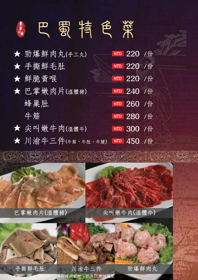 講到麻辣火鍋除了四川麻辣鍋跟台式的傳統麻辣鍋也是吃辣的重慶麻辣鍋的口味也很獨特只是在台灣要吃到重慶口味比較難找 這家位於板橋捷運站附近走路5分鐘的東華川府是很不錯的選擇獨特的重慶風味今天就來探究看看 餐廳的裝潢走非常古典中式風格所有位子都是包廂式, 顧及到隱私兩人吃飯也可以有自己的空間非常不錯總共兩層樓座位空間很夠不過建議如果有預先安排的話還是要訂位喔 菜單的設計上也非常有質感為了在台灣還原重慶老味道主廚特別去重慶當地學習外引進多種獨特風味的辣椒和香料經過8個小時的炒制~72個小時熬煮才會上桌一般人都會點個基本的八卦鴛鴦鍋如果你對原味重現很講究, 可以挑戰看看九宮格除了很吸睛外, 也會完整的還原重慶鍋物的辣度 以全牛油為基底的麻辣湯底上桌時就可以感受到滿滿的香氣雖然看起來很辣不過重慶火鍋有一個去辣的秘訣, 稍後再來介紹 多種不同的辣椒都是從中國直接進口採用重慶最道地方式翻炒再呈現給客人重慶另外一個非常有名的食材是乾鍋之前在中國大陸有吃過,我覺得火鍋跟乾鍋的香氣很有異曲同工之妙 白湯部分使用大骨加上20種中藥材熬煮,沒有加入任何化學調味一開始上桌時先喝一口湯頭,可以感受到濃郁溫暖的感覺 王老吉這個我個人很愛的涼茶在台灣也有手搖飲料店~喝起來不太苦也不會過甜搭配火鍋可降火在中國大陸吃火鍋幾乎是人手一罐 接著就趕快來看看我們今天點了什麼好料吧 尖叫嫩牛肉第一個就先來個手切嫩牛肉每天限量供應的溫體牛肉先搶先贏賣完就沒台灣溫體牛肉質真的最適合搭配火鍋沒有經過冷凍肉質很滑嫩嫩度真的還蠻厲害的如果現場有提供的話絕對是必點 安格斯特級霜降牛 小接著就來試看看美國的安格斯畢竟溫體牛價位比較高安格斯品質也是到位, 吃的沒有這麼心疼XD 油花的品質很不錯分佈均勻比例很剛好~厚切口感也很柔嫩 雪紋脆松阪松阪豬部分跟外面不一樣是師傅手切厚度上非常足夠~每片都超大的吃起來很滿足 十秒豬肝敢吃內臟的朋友一定要試看看這豬肝取名叫做十秒豬肝原因是因為他的厚度切得很薄只要燙10秒鐘就可以吃很特別, 跟外面一般內臟呈現的方式不一樣 新鮮的豬肝光是外觀就讓人流口水啊 野生草蝦王 /5隻不要先聽到草蝦就覺得很普通這個是比一支手機還要長的野生草蝦王啊~~蝦子上來的時候已經處理得很乾淨 比手機還要長的草蝦王絕對可以滿足海鮮控的要求 勁爆鮮肉丸丸子是主廚在店裡新鮮手打新鮮吃起來有彈性絕不會有霜凍感很真材實料 馬鈴薯片如果有吃過重慶料理馬鈴薯片他們說的土豆片, 絕對是靈魂之一不管是乾鍋或者是在麻辣火鍋裡煮下去超級吸味的馬鈴薯絕對可以讓你品嚐出重慶火鍋的精髓 脆藕片除了馬鈴薯片外另外一個蓮藕片也是不能錯過的選擇爽脆的口感加上重慶麻辣鍋的香氣保證還想多點一盤 重慶小麵熟食吃火鍋一般人都會搭配白飯不過來到這邊就不要點飯了, 直接點重慶小麵Q彈的麵體跟獨家醬汁進行乾拌每口都是滿滿的油香我個人偏好再加入一點麻辣湯味道會更濃 重慶火鍋第2個獨特秘訣完全來自於這個香油醬料~他除了他本身香油味道很突出還加入了蔥蒜和香菜~可以有效的去辣同時潤胃沾的時候要讓香油完整包裹會讓肉品更加滑順 一般民眾通常對於重慶火鍋並沒有很熟悉所以第一片肉服務人員會先幫忙示範被香油包裹的肉整個非常亮而且真的可以去掉70%左右的辣度~我覺得不吃辣也可以試看看感受非常特別在用餐期間發現店家真的是很重細節絕對不是馬馬虎虎, 連燈都很呼應整個主題讓人很融入這種中國風火鍋氣氛圍…查看更多