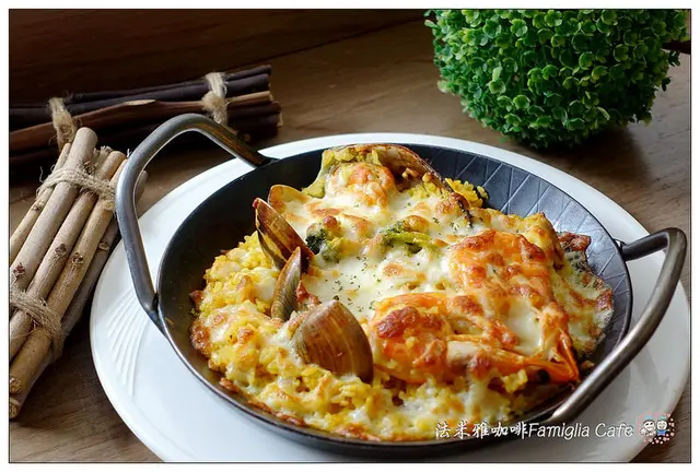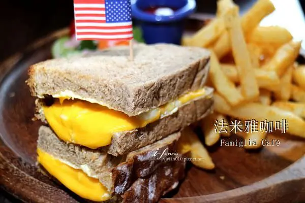 法米雅咖啡Famiglia Café空間寬敞舒適,提供義大利麵、燉飯、排餐、下午茶等。這天點了義式三明治及華麗的英式宮廷下午茶,陪我們渡過輕鬆愜意的午後時光法米雅咖啡Famiglia Café的室內,左側是長型的吧檯,座位區是沈穩的木頭原色。中間的部份是以多人桌為主,靠牆處則以雙人或四人座為主。餐廳的底部有一面書牆,其中放了不少整套的漫畫,可以陪伴消磨一些美好時光。三種起司帕尼尼 $250(附薯條、紅/綠茶,更換飲料折抵$80)炸得金黃酥脆的脆條,在午茶聊天過程中很容易一根接一根的消失XDD這個是加了cream cheese、切達起司及馬札瑞拉起司三種不同起司的帕尼尼。在上桌時就開始不聽使喚地,開始以土石流狀態的起司大爆漿。採全麥吐司輕烤過,加上用料了不手軟的三種起司。既然點了起司帕尼尼,當然少不了牽絲秀囉,呵呵^^一個牽絲到天邊的概念~~這帕尼尼可不是為了表演牽絲而存在,重點是它好好吃!三種起司提供不同的香氣及黏稠感,加上酥脆的吐司,飽嘴又滿足呢!英式宮廷午茶組 $ 499這個華麗的宮廷午茶附了三層午茶組合,另可選兩種飲品。法米雅咖啡Famiglia Café這午茶組的飲品可是一點都不馬虎呢!拿鐵咖啡 $120/單點是有沒有這麼可愛啦!這貓咪咖啡一上桌無不令人驚呼了起來!無論是咪咪眼、耳朵或是蝴蝶結等,細節可是一點都不含糊呢!太可愛了啦!可愛的咖啡,不只中看也好喝喔!香醇的咖啡及奶泡比例都恰到好處。香甜蘋果果粒茶 $180/單點這款德國的香甜蘋果果粒茶,完全就是蘋果本身的清香,是品嚐午茶的優雅陪伴。這午茶組分為三層,就讓艾方妮一層層地來分解給大家看。首先第一層是鹹食,這是在麵包上依序放上切達起司生菜、煙燻鮭魚及酸豆。最後再淋上巴薩米可醋,是多層次的開放式三明治,酸度上較明顯些。另一旁是鹹派,層層香酥的酥皮下包覆著火腿、玉米筍及綠花椰等蔬菜。從外皮的起司及酥皮的香氣,帶出內餡豐富的咀嚼感,奶香四溢且具飽足感第二層是布朗尼與手工餅乾,再加上果凍的組合。紮實的布朗尼大方地加入了不少核桃增加口感,純手工餅乾甜脆美味。這個就像在喝桂圓紅棗茶般的果凍,滿口都是桂圓的甜蜜,做成果凍也很好吃呢!第三層是司康加上奶油及果醬的組合。搭配的果醬是英國品牌TipTree,天然水果的清香及微酸,是英式下午茶的好搭檔。法米雅的司康吃來有種早期比司吉的紮實口感,無論是搭奶油或是果醬都相當好吃!…查看更多