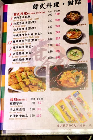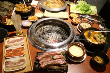 甘釜京 감천부산도쿄 韓日燒肉料理專門店提供多樣化的韓式料理及日式燒肉,另外提供最近很紅的海鮮塔,日韓結合的多元化餐點,很適合歡聚小酌。餐廳內部呈長條形,規劃四人及六人座位為主。晚餐時間幾乎是座無虛席,記得事先訂位喔!店內的大營幕持續播放著K-Pop的歌曲,相當地熱鬧,情緒超嗨。另外備有二樓的座位區約二十多個位置,採日式裝潢別有風情。據知假日的二樓也是常客滿的,所以想來還是先訂位比較保險喔!一開始就有4~6樣小菜,吃完可再續。這個生菜沙拉輕脆可口,對於接下來的重口味料理非常有轉換味覺的作用。接著是五道韓式小菜,小黃瓜、漬洋蔥、馬鈴薯、紫蘿蔔及韓式泡菜。其中最特別的是那個紫蘿蔔,聽說本來就有這個品種,只是多了醃漬顏色更明顯。每樣小菜都有一定的水準,吃完都可再續的喔!艾方妮將針對韓式雙人套餐$1380(會員價)做介紹。共有六樣餐點+飲品+冰棒。雙人套餐是附兩杯飲品,我們另外單點一杯。左起:葡萄氣泡燒酒 $100,柚子冰茶 $60,蔓越莓氣泡燒酒 $100氣泡燒酒喝來酒味並不濃,帶點甜味,但配韓式料理很搭。<未成年請勿飲酒,酒後請勿開車,飲酒過量有礙健康>以下標示的是原單點價格。石鍋拌飯 $200(會員價)甘釜京 韓日燒肉料理專門店提供桌邊服務,韓式拌飯由這位帥妹來負責拌炒。她這天服務相當週到,對於所提問的問題,也回答得十分專業。秘製泡菜湯這個常吃到的韓式泡菜鍋相去不遠,只是少了冬粉,但配料可是不少呢!配料除了豆腐、肉片、金針菇、泡菜及魚丸,湯頭微辣吃來身子暖了起來。奶油金針菇 $100(會員價)奶油金針菇是烤肉時常搭配的餐點,奶油香令金針菇增色不少。韓式海鮮煎餅 $250(會員價)煎得焦香酥脆的海鮮煎餅,有點厚實,加了許多蔬菜多了些甜美。安東燉雞 $380(會員價)甘釜京 韓日燒肉料理專門店的安東燉雞用的是當天的溫體雞腿肉,看起來很讚服務人員先把雞腿肉放入湯中熬煮,還有洋蔥、馬鈴薯、胡蘿蔔、小黃瓜滿滿的蔬菜。另外還有增添飽足感的年糕及冬粉,這個安東燉雞這麼大一鍋400元不到,很划算!點烤肉附上四種新鮮生菜,有美生菜、A菜、廣東A菜及蘿蔓,這好貼心喔!另外也少不了辣椒及蒜頭。烤好的肉,還會剪至適合入口的大小,是不是很貼心呢?水果醬烤肉,吃來頗為清爽,帶著水果醬汁的甘甜。有了特製烤醬的加持,這牛肉更加有味道,也是帶點甜甜滋味。這個招牌醬的味道特別香,帶出牛油脂的鮮甜,煎至赤香令人回味再三。吃韓式烤肉最愛生菜夾肉了,夾入了蒜頭、泡菜及青辣椒,一大口吃下爽度滿分。韓式起司豬肋排烤的時間需比較長一些,服務人員仔細地呵護著這豬肋排。接著取出起司往豬肋排繞啊繞,這簡直太犯規了啦!是的,這個熱量看來爆表的起司豬肋排,怎麼看起來這麼好吃啊!入口後,起司的香滑帶來排的潤滑效果極佳,豬肋排的熟度恰到好處,又香又嫩。尬的,真是太美妙的滋味了!大推啊!韓國冰棒 $50(會員價)這天拜訪甘釜京 감천부산도쿄 韓日燒肉料理專門店,享受到歡聚的氛圍,超開心的。由於餐點很豐富,因此本來想點海鮮塔的,也沒有胃可容納了!那就等二訪再點囉!甘釜京 韓日燒肉料理專門店提供的餐點,很適合多人來用餐,下次再約來歡聚吧…查看更多