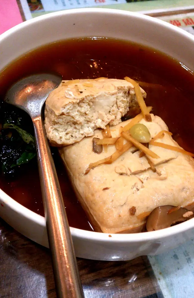 週末雨下個不停 只好在自家周邊找吃的這間位於永和四號公園旁 人氣歷久不衰的小吃店第一次光顧已經是很久以前的事那時候他們還在南勢角夜市 至少有五年以上了吧今天再度捧場 因為天冷就想吃熱熱的 清蒸臭豆腐比起炸豆腐 對身體健康又更好現已拓展一個全座位店面 兩間比鄰可以疏通人潮但是芃NANA到的時候 店外依舊是排隊人潮 印象中他們的東西很好吃、充滿古早味 而且價格又合理正是因為這樣所以深受大家愛戴吧主打全素食料理 但是品項一點都不單調麵食居多 以及招牌的獅子頭菜飯等清蒸臭豆腐辣度分為六級不辣 微辣 小辣 中辣 大辣 超辣 聽說他們的辣油不容小覷但是芃NANA很卒仔的選擇了不辣 就怕沒人分享的情況下 萬一太辣吃不完怎辦等候時間不算長 我的清蒸臭豆腐上桌兩大塊泡在醬油滷汁裡 佐以薑絲、香菇、毛豆等配料香氣撲鼻 光聞就讓人食指大動了來看看斷面秀 臭豆腐的氣孔吸飽湯汁 滷汁的味道滲透豆腐裡層 鹹香夠味十分下飯但吃的時候要小心 以免燙口芃NANA還點了特色招牌紅醋乾麵 以及一盤燙青菜市面上很難找到這樣一道料理看似平凡無奇 完全沒有任何配料但是美麗粉紅色的麵條確實讓許多人讚不絕口有點酸又不太酸的味道 既開胃又解膩清爽的口感 搭配重口味的臭豆腐剛剛好這道麵點還曾經上過新聞媒體 超人氣自有它的道理瞧瞧, 他和綠色的青菜放在一起 紅配綠多美最後附上偷拍對面先生點的獅子頭菜飯看它的擺盤和份量 芃NANA再度唾液氾濫下次一定要親口吃到啊!一旁的小菜區 一碟25元很便宜 種類也很豐富有眼尖發現紅醋也被拿來醃漬蓮藕片嗎建議揪個三兩朋友 就可以拿很多一起分享不怕吃不完囉…查看更多