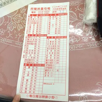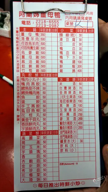 天冷不外乎就是想到薑母鴨~而每次載芝芝小姐回家,都會經過這家當地有名氣的阿蘭姐薑母鴨! 這裡總是顧客超多,讓我心動萬分~但每次說要吃,就總是沒機會去吃... 剛好今天還有老爸和老弟的陪伴,咱們四人就往阿蘭姐前進~ 招牌真是大呀~往往經過,顧客還真是多!不過除了薑母鴨外,阿蘭姐裡還蠻多其他的可以選,像是麻油雞、清燉羊、燒酒雞等。 店裡位子也很多,所以我們馬上就有位子哩~(剛剛好補捉到野生阿蘭姐在櫃台哈...) 店裡都是用紅標料理米酒。上頭還有紅面薑母鴨的娃娃,真是可愛~(不過.....等一下卻是要吃你們...) 雖然今天不是補冬,但這補冬的紅紙,是否真讓人很有氣氛~ 一開始店員送上了招待小菜。 這豆干真的不錯吃,口味算重,也有辣度。 當然吃薑母鴨營養也是要均衡,就先來個花椰菜 (50元)和高麗菜 (50元)吧。 青菜都很乾淨,花椰菜也不是冷凍的。(不過高麗菜有點少就是了~) 麵線 (30元,乾),此為兩份。 麵線跟外頭一般的差不多,表現得中規中矩。 薑母鴨 (350元)上桌囉~裡頭我們加了鴨血 (30元)、鴨肉小丸子 (50元)、金針菇 (50元)和泡菜鮮肉丸 (50元)。 跟一般外頭薑母鴨店比,價格是有多一些些。 當然最一開始一定要先嚐一下湯頭囉~ 哇!一開始的酒味頗重的,但是等酒氣全煮開後,那湯頭真甜,薑香也很重,帶有微微的薑辣感,但不會不舒服,喝起來很溫暖。不過口感上是比較濃郁些。(應該麻油用的夠本吧哈~) 薑母鴨必配的腐乳醬,在這卻有兩種腐乳醬。左邊的顏色較深沉,吃起來口味醬重,右邊的就比較常見,但吃起來很香耶! 另外要誇誇的就是這泡菜鮮肉丸,泡菜加入丸子裡還真少見,尤其在薑母鴨店裡,更是特別~ 酸甜感帶有點微辣度,這鮮肉丸真的很不賴。 除了湯頭好喝外,最讓我大讚就是它的薑母鴨肉質富有彈性,吃起來不會鬆鬆老老的!! (因為當天沒吃完,所以打包回家吃。再煮一次,肉質依然有彈性!!真的大讚~) 阿蘭姐裡最不一樣就是,除了鍋物外,還有熱炒可以點。韭菜炒下水 (200元)。 鴨內臟部分都很新鮮,鴨胗很有嚼勁,不過牙齒不好的人可能不太愛~鴨肝軟嫩好吃!韭菜也給的大方,醬汁來說偏甜些,算挺重口味的。 飽餐一頓後,在準備離開後,發現桌上有一大鍋的薑母!!難怪湯頭的薑香味這麼明顯呀~ 而且今年薑比鴨還貴,但是湯頭依然薑味十足,喝過湯頭,就知道這絕對沒有偷工減料~所以新店也有間很棒的薑母鴨店呀!!…Read More