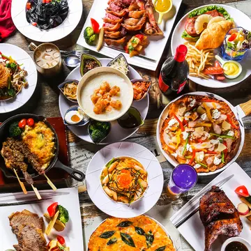 微型蒸海鮮雙人火鍋 / 和風瓦片牛排 / 漸層特調 / 深海珍魷風味燉飯 / 醬烤春雞 / 什錦炸物拼盤
