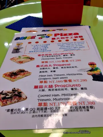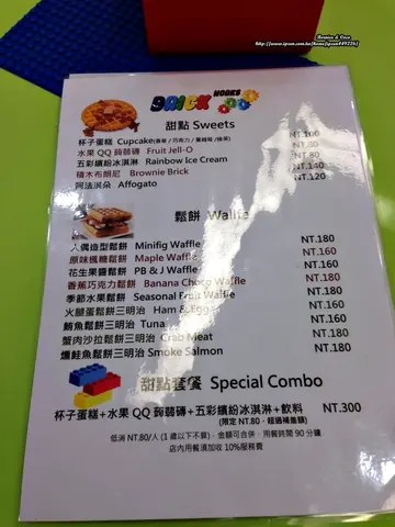 你知道嗎??新北市也有樂高餐廳喔!獨家的BRICK WORKS樂高餐廳就開在環球購物中心(中和店)保有童心的我平日就喜歡逛玩具店買娃娃所以常被女兒唸我是小朋友這天來到中和環球店,晃到3樓玩具店突然看到一家新開的店門口擺了一尊長像短小又矮胖的蝙蝠俠(非常逗趣)外圍全是樂高積木組成的玻璃櫃看到這小弟弟看樂高看得出神(好可愛喔)一進店內左邊是販賣樂高玩具的相關產品右手邊則是用餐區和遊戲區 這次沒帶相機用手機拍所以照片可能會有點糊(冰友啊!忍耐點看嘿)用餐區的色彩很鮮明~紅藍黃的椅子搭上藍色的桌子一看就讓人滿心歡喜來這用餐的客人幾乎是媽媽帶小孩在櫃檯旁站了一會對櫥櫃裡的東西(我特有興趣的啦)看看這餐點也太可愛了吧!除了杯子蛋糕以外最吸引我的就是人偶鬆餅了尼看看~是不是呢!一直在等服務生帶位,但就是沒人理睬我們那A安捏~我也是媽媽帶小孩(只不過我是帶~大~大朋友)看看這區就可以知道為什麼服務生過了好久才招呼我了吧!這根本是小小孩的天地嘛!!坐定位後就來點餐囉看看MENU有披薩 鬆餅 杯子蛋糕..等(低消80用餐時間90分) 選了人偶鬆餅和香蕉巧克力鬆餅飲品則是拿鐵和卡布選完餐點就到一旁的櫃檯點餐當時有優惠活動,滿500送贈品我選了樂高手環(拿回家我也不會組,總覺得缺了什麼)是要我再去買積木來拼嗎?(早知道就選鑰匙圈,挑什麼手環啦)等餐的同時就順勢拍拍販賣區的樂高這裡有整組販售也有人偶自由配自己選擇喜歡的樣子搭成人偶帽子或頭髮+頭+上半身+下半身=100元每個桌上都有一個紅色的積木盒可以讓小朋友裝積木到桌子上玩但我始終沒碰它(ㄚ~妳不是小朋友)原本對親子餐廳的咖啡不抱任何希望的想不到這裡的卡布和拿鐵都還蠻順口的(奶泡打得也很細)期待的人偶鬆餅上桌囉!旁邊五顏六色的小圓球有點像似某個廠牌的早餐穀片有專利的東西不便宜呢!要價 180元人偶鬆餅外皮酥酥脆脆的整體感覺好像在吃大的雞蛋糕貴森森的鬆餅再多看一眼餐廳裡使用的餐具也是積木刀叉我這老人家用起來有點不好使喚呢附贈的冰淇淋再來介紹積木布朗尼 140 積木形狀的蛋糕加上一球冰淇淋送上桌時還有點微熱,口感還算綿密(至少它不是發糕)香蕉巧克力鬆餅 180 外觀擺盤還算漂亮看似甜膩卻一點都不膩外皮酥酥脆脆,內部軟Q(有點像美式煎餅)這道算是今天餐點中最好吃的 香蕉和巧克力配在一起一直都很搭不過甜的口感倒是讓我很滿意這裡的低消是80元,用餐時間90分如果下雨天不知道哪溜小孩,這裡倒是一個好場所小朋友自己就可以在一旁玩得很開心,媽媽也不用跟著跑馬拉松以上是我的用餐資訊在此提供您參考 查看更多