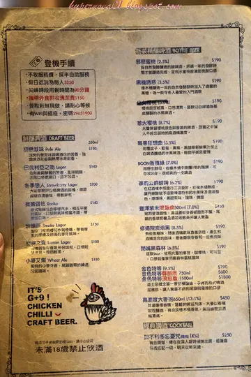 禮拜五又是一個歡樂Happy Day!下班之後揪個三五好友或者老同事一起吃飯一起喝酒歡樂一整晚!王子新推薦板橋車站附近的G+9鮮釀餐廳(國光店),回程搭個火車或者捷運真的超級方便的喝酒不酒駕享受精釀啤酒的夏季活力吧! 或者禮拜六早上睡得有點晚,想吃個早午餐去精釀啤酒吃早午餐? 也是可以喔! 對了,說好的美食呢?板橋聚餐少不了的美食,這裡一定有那下酒菜呢? 炸物拼盤? 別擔心這裡一定能滿足喝酒狂客的需求! 距離板橋車站走路三分鐘的距離這麼近的的板橋酒吧一定要收錄其中 喝酒好朋友那就是鹹酥雞等多樣下酒菜不過,G+9也有提供早午餐喔,不僅是晚上白天也有供應各種美食另外低熱量早餐這裡也有提供呢! 除了店內用餐 還提供外送服務想要在家裡吃炸雞! 宅配到府準沒錯 精釀啤酒餐廳板橋首選G+9(怎麼聽起來好像出國旅遊的機票+酒店的縮寫XD)店內除了隨季節變化的精釀啤酒還有好吃的義大利麵! 想吃飽的朋友可以放心地在這裡吃飽飽在回家呢 許多網友推薦的精釀啤酒吧檯很適合跟他合照!酒鬼的IG證明阿 店內酒類眾多最近有新菜色、新酒單出爐最新最Hot的就要加G+9鮮釀餐廳粉絲好友,看看引進什麼好料呢 今天想喝什麼?我想要夏季的味道,帶有酸酸甜甜滋味店員會熱心推薦適合的精釀啤酒囉 店內採用英倫裝潢設計加上優雅的音樂真的一秒飛英國的感覺呢 除了店內用餐空間店外也有戶外用餐區 不過,夏天麻還是躲在冷氣房爽爽用餐囉 店內用餐的好朋友:免費提供充電服務!吃東西打卡分享美味的餐點,沒有電力會很煩惱耶不用擔心,G+9讓你手機活力滿點! 店內低消 NT250 今天來個雙人餐配個精釀啤酒囉(Craft beer)簡單吃一點 配上豐富一盤 再加上煙燻雞肉木盆沙拉 再加個來一點早炸滿滿的分量一次滿足! 呼叫美食上桌店內現點現做,需要等待上桌囉 肚子餓了不知道要從哪邊開始下手呢?就從沙拉開啟美味的時刻吧 來個大份量的 凱薩醬佐醃燻雞肉沙拉上面的刨片起司滿滿的,最喜歡吃有起司的沙拉! 淋上濃郁的凱薩醬大口吃美生菜的甜味與煙燻雞肉的多汁口感滑順、清新、自然,讓我們迎接下一道菜餚的到來 什麼都來一點炸物有薯條、起司條、雞塊、洋蔥圈完全是喝酒、喝飲料的好夥伴呢 起司條軟綿好吃吃完炸物拼盤飽足感可是有呢 ! 店員推薦的黑糖誘惑(左)與瑪莉公爵(右)兩者都是夏季的飲品呢 未成年請勿喝酒 開車勿喝酒!!! 兩種飲品不同的色調與味覺體驗 黑糖誘惑帶點冬瓜糖的香味與焦糖香氣喝起來卻是驚喜的果酸味 瑪莉公爵味道更是強烈許多,他有濃郁的黑醋栗的酸度第一口會被強烈的酸度嚇到,但餘韻無窮果真是酒類評鑑的綁上熱門酒類喝完後有一種強烈的食慾正在蔓延開來! 來個簡單吃一點奶油烤土司配上炒蛋、嫩煎培根、剛好份量的生菜沙拉是剛睡醒的朋友最佳的選擇 讓味覺逐漸覺醒,讓美味道留存 豐富來一盤肚子有點餓了,來一盤豐盛的早午餐依樣搭配奶油烤土司、起司歐姆蛋、舒肥嫩雞、生菜沙拉清爽簡單 一點都不複雜美麗的早午餐就從這裡開始延續 享用過美好的早午餐享受人生的豐富與自在 …查看更多