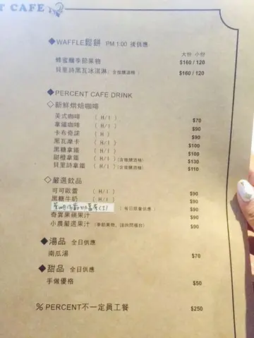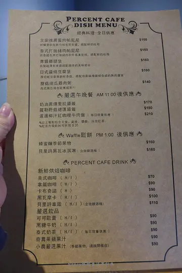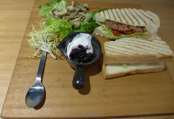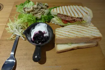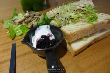顆顆顆~Nancy又成功的踩點了,而且還是本週才開幕的新點喔PERCENT CAFE%離江子翠捷捷運站,步行距離大約2-3分鐘的路程離Nancy家大約只要不到10分鐘的散步路程大家也都知道,我個人現在空閒時間很多,除了找工作面試之外,最主要的工作就是把我家的寶老大照顧的服服貼貼的(話說這樣我真的好像照顧老爺爺的泰勞喔XD)剩下來的時間就是自由利用啦在228三天連假中,就路過PERCENT CAFE%,知道3/1是它們正式開幕的時間只是當下不確定銷售的商品內容前二天路過時 ,發現原來PERCENT CAFE%營業時間從早上8點開始,而且也有提供早午餐~(擇日不如撞日吧!)除了早午餐,PERCENT CAFE%也有提供午餐,午茶,晚餐,從早到晚任何時間都提供餐點MENU如上提供給各位參考,以餐點的種類來說相對性選擇沒那麼多不知道將來PERCENT CAFE%是否會再增加多些餐點品項 Nancy個人是南瓜控,其實當我看到"蘑菇南瓜雞肉粥"時,真的滿想點它的,不過還是先點早午餐吃吃看(噗)店內空間擺放的桌數有限,所以不會讓我有桌次與桌次太靠近的拘束感除了二張四人桌之外,還有一大張多人桌子,這一大桌一次大概可以容納10人吧還有靠近落地窗採光極佳的位子(唉~原本我也想坐這邊假掰一下的,但腿太短)可愛的草皮小狗兒(圓滾滾的真像我家寶少爺XD)開水/餐具自取區,一旁還有可置放包包的提籃附餐中的冷泡紅茶(可補差價更換其它飲品)份量不大杯,無甜度,但相當的順口絲毫沒有苦澀味(老闆,我可以加點大杯的嗎XD)與之前吃到早午餐不太一樣的點,大多的早午餐店附餐通常是附薯條或是沙拉PERCENT CAFE%所搭配的是溫沙拉與優格,真的健康度又增加了幾分以木板盛裝了食物,多了一分特色(滿特別的又不覺得奇怪)溫沙拉中的菇類以比較重口味的黑胡椒調味過,底部鋪上單純只用橄欖油拌過的生菜單吃或混合一起吃各是有不同的滋味在泰式料理中常見的打拋豬出現在早午餐中會是怎樣的滋味???店家將常見的成肉末狀的打拋豬改良作成肉排,其於的方式皆跟泰式打拋豬一樣一口咬下肉排的肉汁混合著一股辣感襲來,這辣度相當的明顯,大約是小辣程度肉排的辣度混合著蕃茄的甜度,雖然辣的我的嘴巴有感,但還是我吸引我一口接一口的吃~而土司雖然有烤過 但還是保有水分與鬆軟感,這是我家老公會喜歡的土司口感現在整個口腔中微微的辣感,在吃下原味優格配上藍莓果醬,舒緩了口中的辣度這組合剛剛好~如果你還能吃辣,真的建議來吃吃看PERCENT CAFE%的泰式打拋豬帕尼尼,明顯又不會過頭的辣,真的還滿舒服的但如果你不能吃辣,那等我下次回訪時再吃吃不一樣的餐點再來回報給各位…查看更多