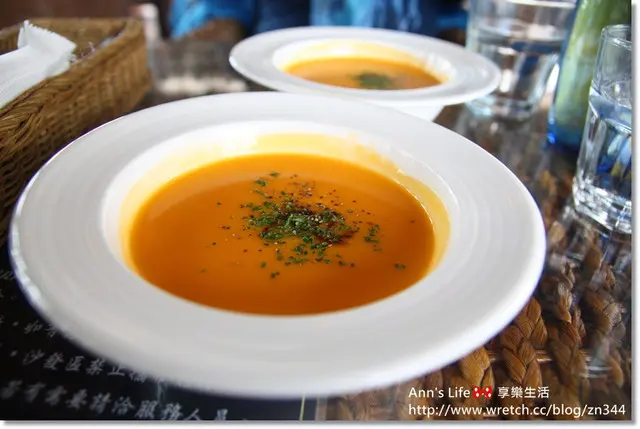 還真的是熱呼呼的,心裡的花朵都綻放了,而且南瓜湯濃郁香甜,第一道料理就得分!