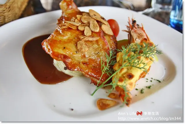 乳酪也沒有搶過雞肉本身的鋒頭,倒是一旁的海大蝦上層鋪著一排吐司丁焗烤是我第一次見到,