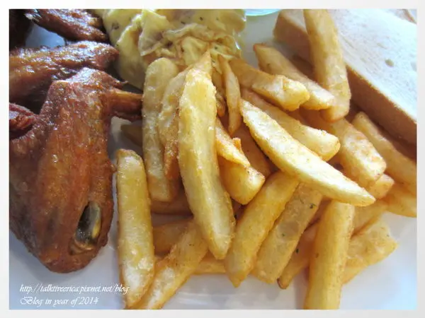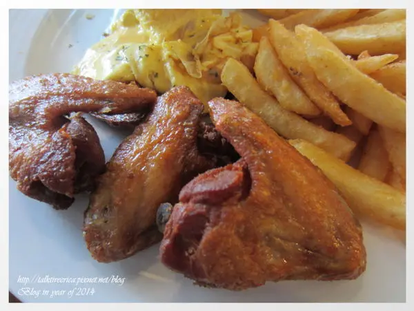 辣雞翅、炒蛋、炸薯條與烤麵包