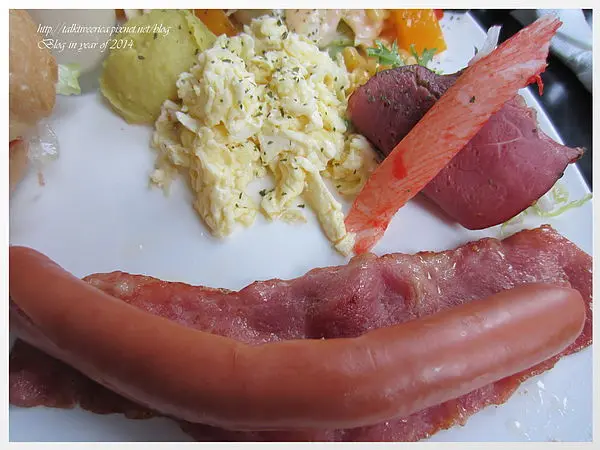 沙拉、德腸、培根、炒蛋、地瓜泥,還有蟹腳棒與黑胡椒牛肉