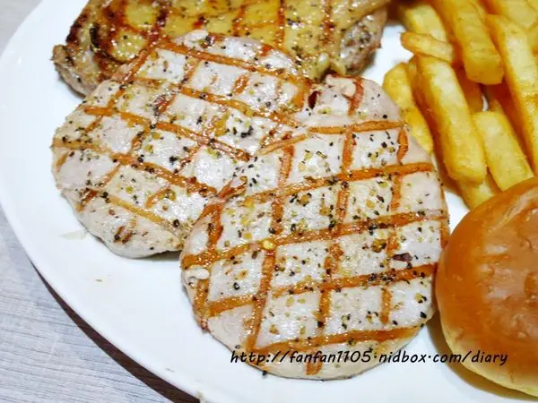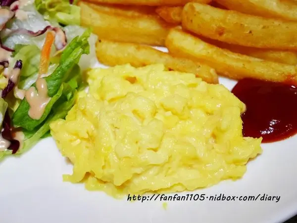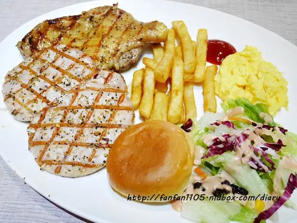 每份主餐均有搭配薯條、爆漿餐包、沙拉、滑蛋,份量十足