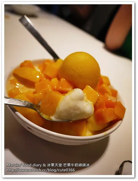 比起剉冰或者雪花冰,綿綿冰和芒果更融洽,綿綿冰採用的是用挖勺挖入盤內盛裝製造