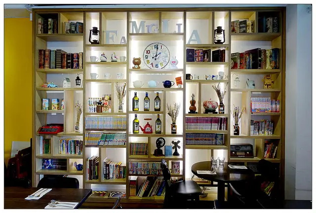 店內最吸睛的是這一面放置了大大小小擺飾品的造型牆
